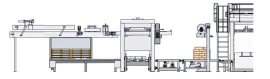 La línea de paletizado sin palet (palet-less) forma el palet envuelto en fundas de plástico retráctil, con una disposición de sacos en la parte inferior que permite la introducción de las uñas de la carretilla y realizar la manipulación como si de un palet normal se tratara.